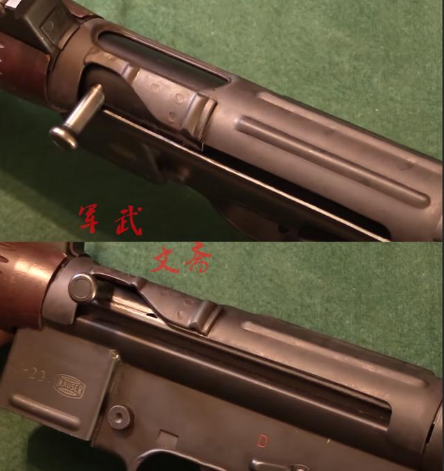 和当时的很多枪一样,STG-45也是设计了一个防尘盖,只不过,其防尘盖有点大,覆盖了整个机匣盖顶部的,相对来说有点麻烦。从这里可以看出,STG-44其实是带有当时很多自由枪机原理的枪械特征的。而STG-44也只是在抛壳口位置有一个防尘盖,起落式的那种,比STG-45要方便的多。