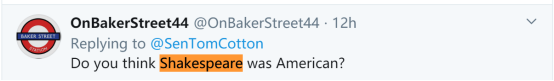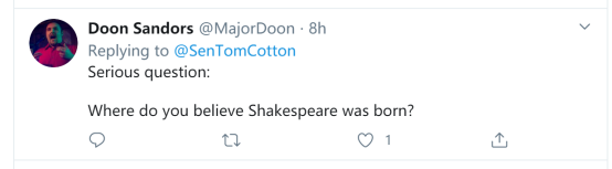 【环球网报道 记者 丁洁芸】“如果中国留学生想来这里学莎士比亚和《联邦党人文集》,这是他们需要来美国学习东西,他们不需要来美国学习量子计算和人工智能”,26日,曾就疫情指责中国的美国共和党参议员汤姆·科顿再次刷新很多人的三观,他这番神逻辑言论被福克斯新闻、福布斯等多家美媒传播,他还指责新冠肺炎疫情大流行是“中国政府对世界的蓄意和恶意攻击”,宣称中国“想抢先发现疫苗作为筹码”。听完这些言论,有美国网友忍不住提醒:莎士比亚不是美国人。
