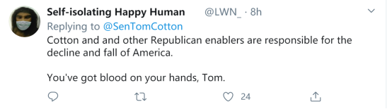 “科顿和其他共和党支持者要对美国的衰落负责。你手上沾着血,汤姆”