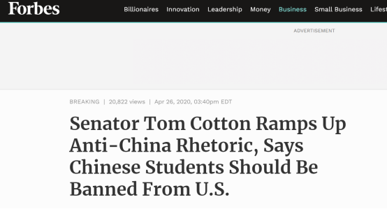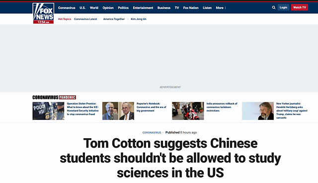 科顿接着说,美国应该“认真审视”发给中国公民的签证,他还建议限制中国学生在美国大学学习科学技术相关领域。“如果中国留学生想来这里学莎士比亚和《联邦党人文集》,这是他们需要来美国学习东西,他们不需要来美国学习量子计算和人工智能。”科顿说道。