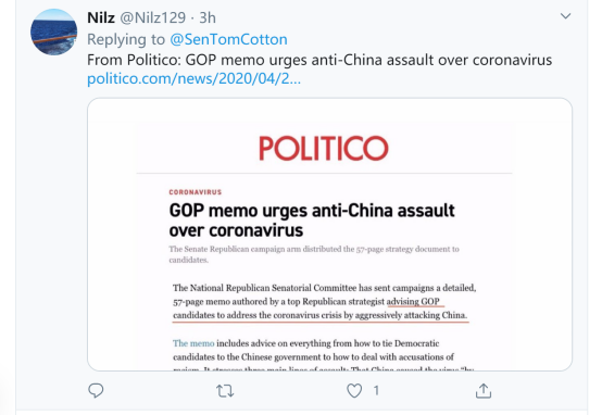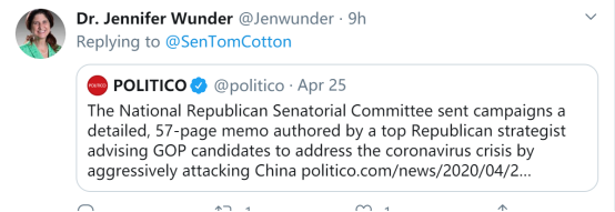 还有网友直接贴上了共和党参议院全国委员会向竞选机构发送一份长达57页的备忘录的报道链接。该备忘录建议共和党候选人通过“积极攻击中国”来应对新冠疫情危机。有媒体曾指出,科顿是这个“剧本”的总策划布雷特·奥唐奈曾经的客户。