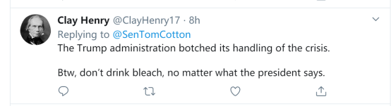 “特朗普政府在处理危机时表现拙劣。顺便说一句,不管总统怎么说,都不要喝漂白剂。”