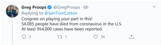 “恭喜你在其中扮演的角色!美国已有54085人死于新冠病毒,至少有95.4万确诊病例。”