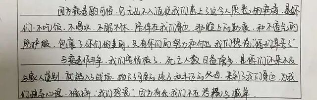 “无恙,见信好!我知道了你的名字,知道你来自四川,知道你和我一样29岁。可你在门外,是为祖国鞠躬尽瘁的勇敢的90后,我却在门内拖祖国的后腿,每当看到窗外默默奋斗的白色身影,我的负罪感就加深几分,多想向着阳光大声呼喊:还祖国一片安宁,让你可以早日回家!”