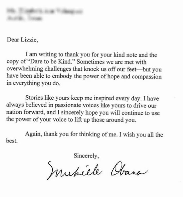 总统奥巴马夫人,写给丽兹的感谢信