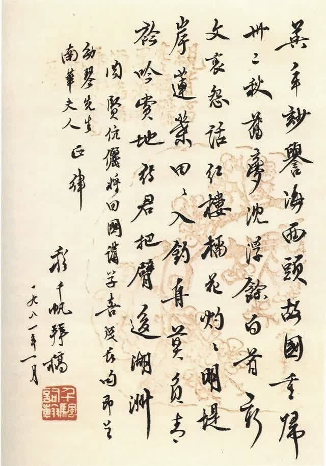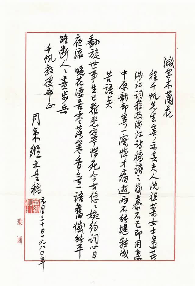 客岁五月在上海讲学时,曾上寸笺,又附呈四十年代与萧迹园先生诗一首,想早察及。国际“红学”会议先生主持其事,备极辛勤,亦于报刊及返国代表处阅之。旋闻将于客岁九月来宁,师生均翘首以望,后乃知以事改期,今确知将于四月莅止,幸甚幸甚。《读〈红〉》一首用意超妙而风调沉咽,以诗代书,杜老家法也。同门友潘石禅先生多年未通音讯,顷由其在港弟子马力转来短札,弟已作复,因知先生与石禅亦系挚交,今后如有交流著述及书问或请先生代转或蒙惠诺也。弟在此指导研究生治唐宋诗词,深苦于海外学人(尤其华裔学者)之研究成绩所知太少,前曾请叶嘉莹教授等代为搜集,已得若干,今将其列目陈上,倘有其他论著方法新颖,议论精辟,足供诸生学习者,幸为代觅若干种,以复印单篇论文最好,专书亦可,内容以诗词为主或文学批评,费用当于尊驾来华时以人民币偿还,不知可否,尚乞裁定。近作论唐人行卷小册子,又亡室沈氏《宋词赏析》各一册已寄呈教正,别有数种在印刷中,先生来时当面呈也。先生此次来南大讲学,当局极为重视。白尘先生因专力创作,近又成《阿Q正传》电影剧本,已辞去系主任,新任主任叶子铭副教授乃现代文学专家,于茅盾研究尤精,渠于亚明先生出示尊函后,即请古典文学教研室主任王气中教授(散文专家,尤精《史记》)及弟负责协同外事办公室,准备招待各事,其细节当别有正式函件奉达,想不日可收到也。南大因无医学院,南华夫人讲学事已由南大向医学教育部门联系,其详尚未及知,容更奉告。照片二纸,小诗一篇附呈。即颂