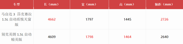 马自达3 昂克赛拉长宽高分别为4662*1797*1445mm,轴距为2726mm。英朗的长宽高为4609*1798*1464mm,轴距为2604mm。从高度和宽度上看,英朗更具优势,能更好的满足高个子身材等的需求。小编在试驾两辆车的时候,也发现英朗的后排空间和后备厢的空间表现力更好,更适合居家使用。