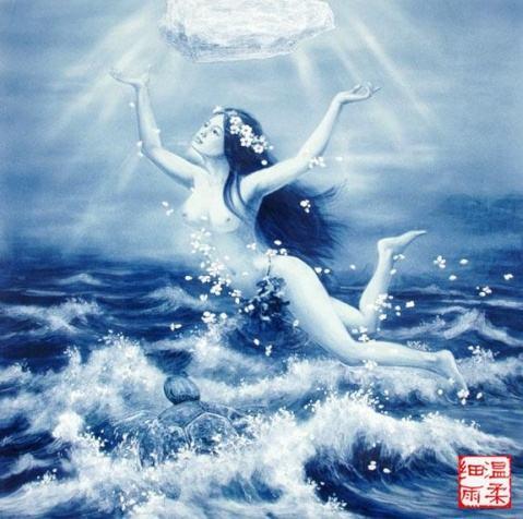 在我国许多地方,还把女娲看作是以身化万物的创世之神,都流传着女娲正月初一造鸡,初二造狗,初三造猪,初四造羊,初五造牛,初六造马,初七才造人的传说,正如《汉书·律历志·上》所载:“七者,天地四时,人之始也。”可见,女娲不但是炼五彩神石补天的英雌和创造繁衍人类的功臣,还是一个开启万物的伟大的自然女神。