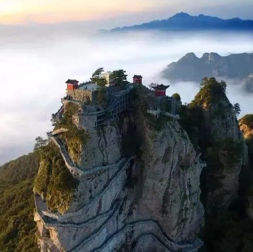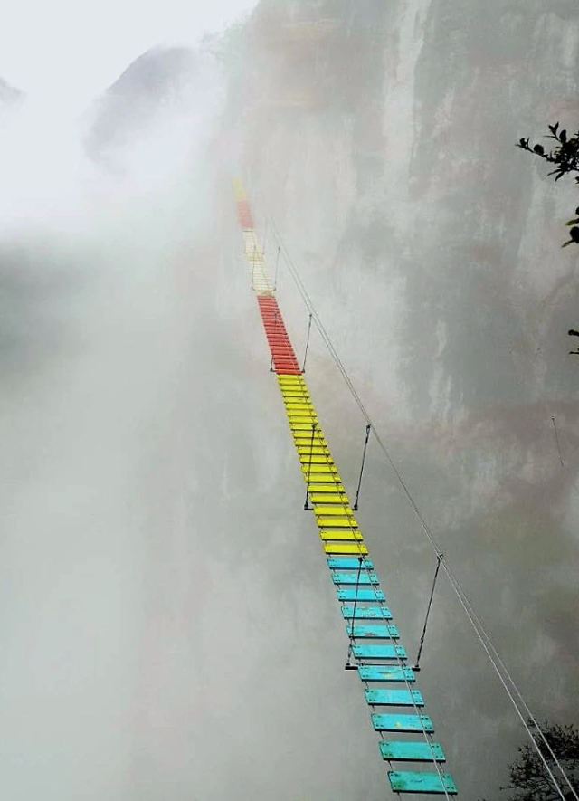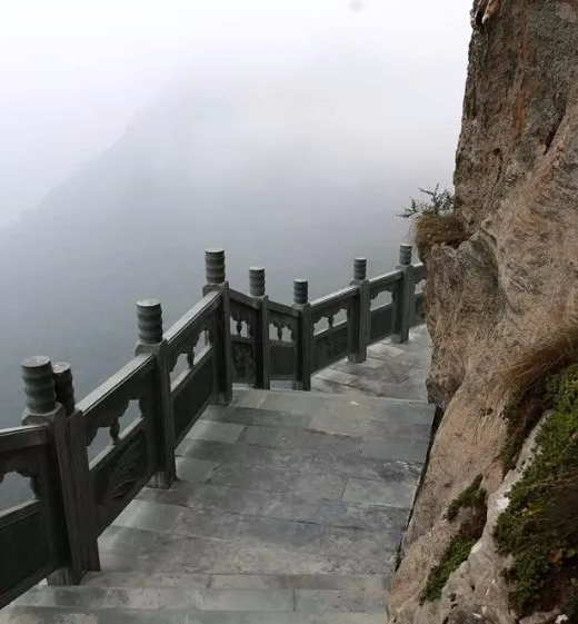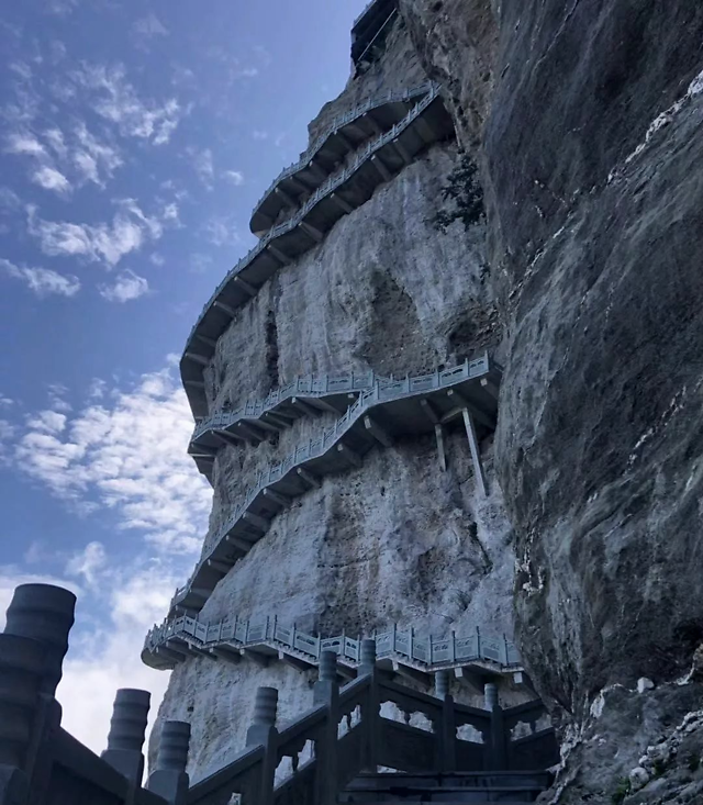 大明峰海拔高1316米,栈道全长7000多米。顶峰的悬空栈道全长是1000多米。全部是在悬崖绝壁上靠人工修建而成。