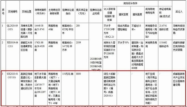 4月29日,成都交投华联置业有限公司拿下位于成都高新区绕城高速以北、锦悦东路以南、天府大道北段以东的190亩商服用地(地下)、交通运输用地(地下)地块,成交价154万元/亩,总成交价约2.92亿元,建设用地面积约12.67万方。