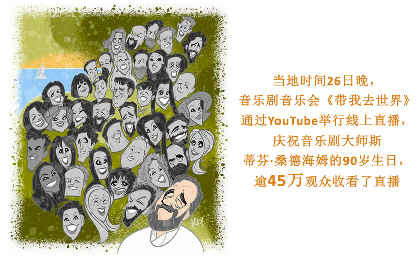 当地时间26日晚,音乐剧音乐会《带我去世界》(Take Me to the World)通过Youtube举行线上直播,庆祝词曲全才、音乐剧大师斯蒂芬·桑德海姆的90岁生日,逾45万观众收看了直播。林-曼努尔·米兰达、梅丽尔·斯特里普、帕蒂·卢波恩、丽娅·萨隆加等明星参与了特别表演,导演斯蒂芬·斯皮尔伯格也送上视频祝福。