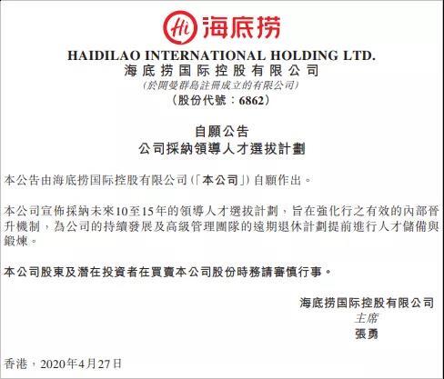 同日,海底捞也发布自愿公告,宣布了公司采纳领导人才选拔的计划。