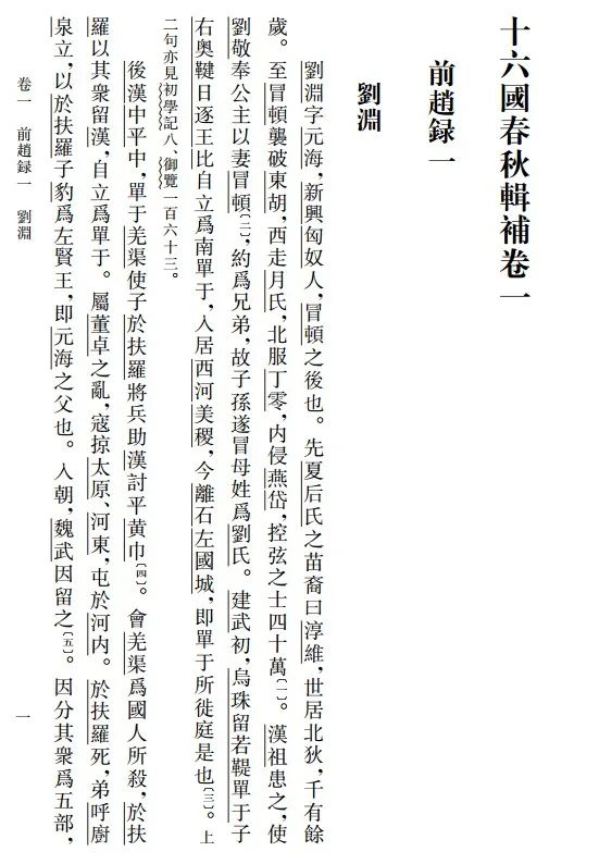(一)区分来自《纂录》与《晋书》传记的内容。在今天看来,汤球对《纂录》的使用有两个明显缺陷:一是将其与《晋书》传记合为一体,不再注明出处;二是《纂录》本身来源有疑,价值不高,若今人研究十六国史事,需要将其还原到《太平御览·偏霸部》。因此本次整理工作使用《御览·偏霸部》与《辑补》核对,难以核实时再参校《纂录》、屠本等汤球实际利用的文献。