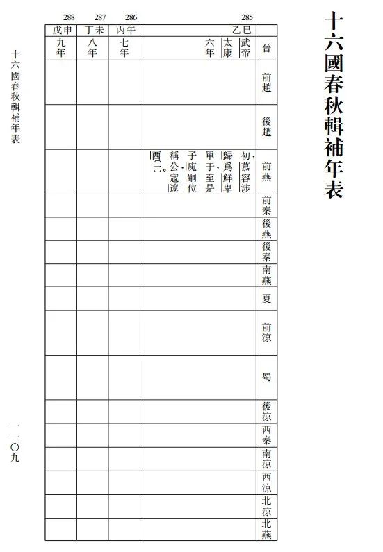 本次整理《十六国春秋辑补》,是我们承担的高校古委会的古籍整理项目。从立项以后,我们成立了整理工作小组,既有分工负责,也有集中讨论,由罗新和聂溦萌负责全部文稿的审校工作。具体篇章的分工如下:华喆负责《年表》《前赵录》和《北凉录》,王珊、聂溦萌负责《后赵录》和《前凉录》,聂溦萌、胡鸿负责《前秦录》《西秦录》和《南凉录》,常彧负责《前燕录》《后燕录》和《南燕录》,陈侃理负责《后秦录》《夏录》《蜀录》《后凉录》《西凉录》和《北燕录》。整理稿都经过整理小组的审读和校改。
