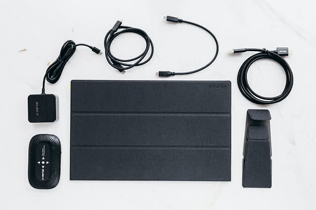 配件方面包含了主体、支架保护套、多个C2C充电线和数据线,HDMI高清线以及45W充电头,另外因为整块屏幕采用了Typc-c接口,所以整合了一个HUB视频盒子,用于连接其他非C口的设备。