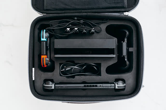 这个收纳包可以放下四个 JoyCon手柄连同握把,同时放下主机+收纳壳+Pro手柄,以及原厂巨大无比的底座和充电头。