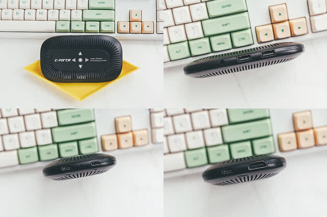 因为是轻薄设计,所以接口受限比较多,其他接口要通过这个HUB去实现,HUB自带两个USB-A接口,一个3.5mm耳机接口,三个Type-C接口以及一个HDMI输出接口,同时也集成了屏幕OSD菜单调节。