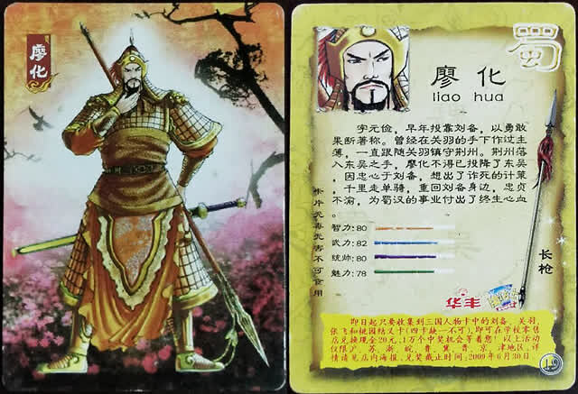 曾为关羽主簿,关羽败亡后归入孙吴,用诈死之计回归蜀汉,刘备授任为宜都郡太守。刘备去世后,为丞相参军,后为广武都督,迁阴平郡太守,多次参与蜀汉的北伐。官至右车骑将军,假节,领并州刺史,封中乡侯。蜀汉灭亡后,徙往洛阳,在中途病逝。廖化以果敢刚直著称,是蜀汉后期的重要将领。
