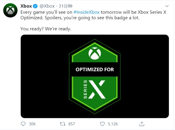 微软XBOX官方今天表示,明天你将在#InsideXbox上看到的每款游戏都将经过Xbox Series X Optimized(优化)。因此你会经常看到此徽章。
