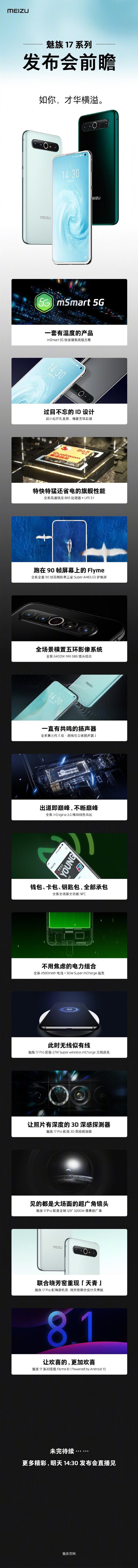 汇总目前预热的魅族17系列的配置信息来看,该系列机型将全系全量采用一块定制三星90Hz刷新率Super AMILED护眼打孔屏,搭载高通骁龙865处理器;支持mSmart 5G技术+Wi-Fi 6;后置相机的主摄为6400万像素索尼IMX686传感器引领的五环横置影像系统,包括定制的129度3200W广角和3D深度探测器;内置一块4500mAh大电池,支持30W有线快充,Pro将支持27W无线快充和40W有线快充;机身配色分别有十七度灰、独角兽、松深入墨,同时Pro版将会有与晓芳窑联名的陶瓷机身「天青」配色。目前官方再次公布,在音效方面,该机将配备第三代“双·超线性立体扬声器”。支持第三代mEngine 3.0 横向线性马达。支持全场景全功能NFC功能。全系预装基于Android 10底层的Flyme8.1系统。