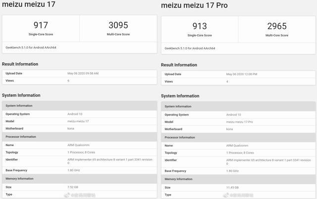 另外,日前,数码大V爆料还爆料了魅族17系列的Geekbench5跑分,其中魅族17的跑分为917和3095,魅族17 Pro的跑分则为913和2965。从跑分上来看,似乎魅族17标准版性能要比魅族17 Pro的性能高出了一点。在配置方面,该截图上显示的信息也印证了官方关于魅族17系列的预热信息,该系列机型搭载了骁龙865处理器和标配8GB LPDDR4x内存,Pro版配备的12GB运存则采用的是LPDDR5内存,这也与此前网间推测的基本一致,系统升级到Flyme 8.1.1,底层也升级到安卓10。