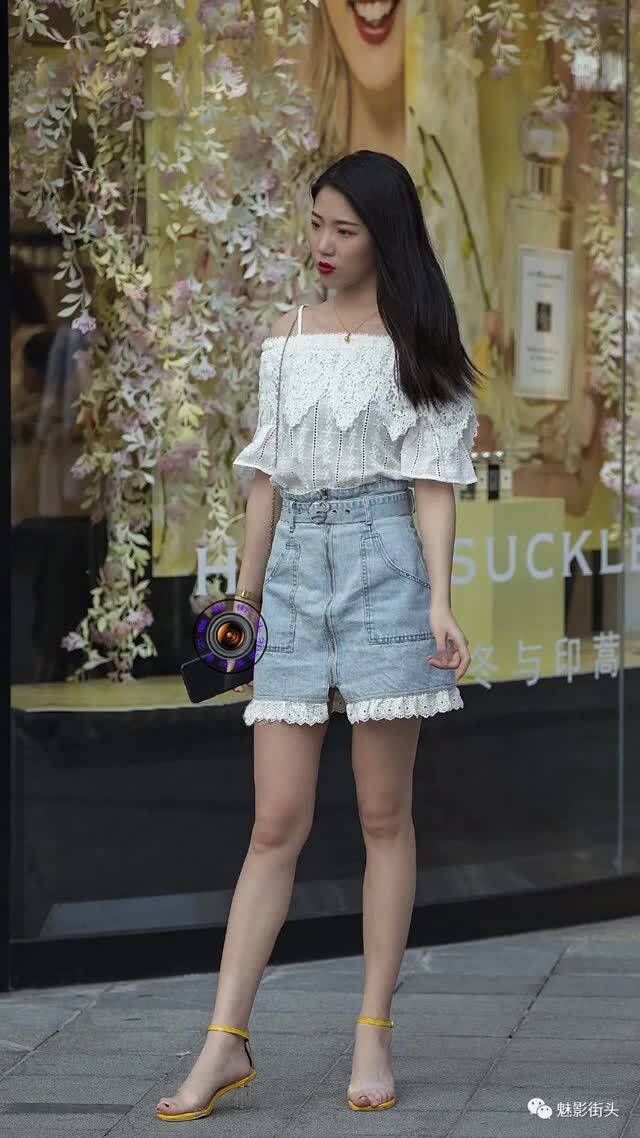 这个美女选择的水晶高跟凉鞋和上一位美女的凉鞋是同款,嫩黄色的加持更显皮肤白嫩。美女用它搭配了一条牛仔裙,这款裙子采用了高腰设计,裙边加上了白色蕾丝花边,可以说是牛仔裙中装饰比较多的一款了。上身穿一件白色一字肩上衣,领口大量的蕾丝花边设计,凸显锁骨美的同时还提升了时尚指数。美女用蓝色搭配白色,在黄色水晶高跟凉鞋的衬托下,打造出了清新唯美的气质。