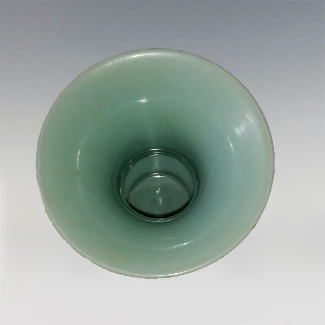 此件为汝窑花觚,此件仿青铜酒器造型,喇叭形口,细腰高身,平底,中下都印有炫纹状。通体施青釉,釉面滋润肥润,器型端庄,气势雄伟,典雅精细,保存完整,具有极高的收藏价值!