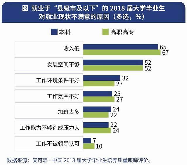 虽然“小城”青年在月收入这一“硬指标”上不占优势,但他们的就业幸福感并未被拉低,与全国平均水平基本持平。对影响“小城”青年就业满意度的具体原因进行进一步分析发现,毕业半年后就业于“县级市及以下”的2018届大学生认为,“收入低”(本科:65%,高职高专:67%)和“发展空间不够”(本科:52%,高职高专:52%)是他们对就业现状不满意的两大主因,与全国平均水平基本持平。