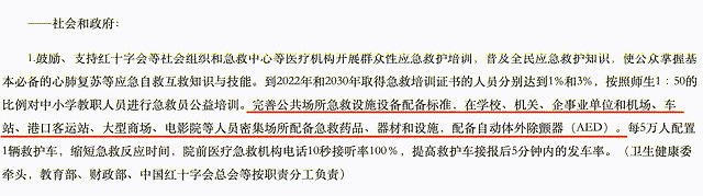 《健康中国行动(2019—2030年)》中「心脑血管疾病防治行动」一章中指出:完善公共场所急救设施设备配备标准,在学校、机关、企事业单位和机场、车站、港口客运站、大型商场、电影院等人员密集场所配备急救药品、器材和设施,配备自动体外除颤器(AED)。