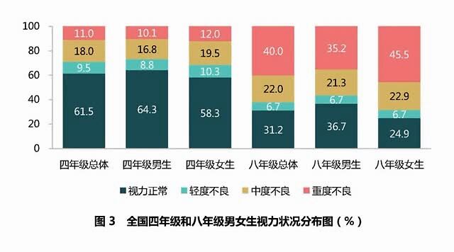 而教育部2018年《体育与健康监测结果报告》显示四年级和八年级学生视力不良检出率分别为38.5%和68.8%,较2015年有所上升。