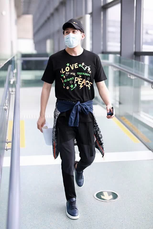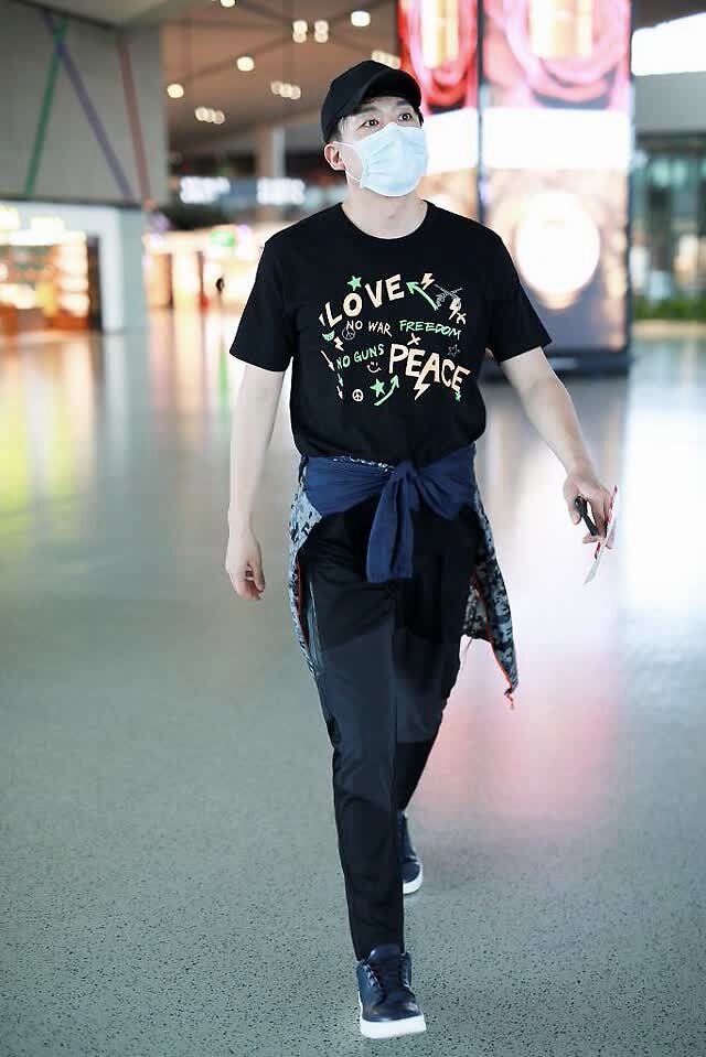 5月9日,演员孙艺洲现身上海机场。他身穿印花T恤和运动长裤,头戴棒球帽,一身黑的打扮低调中尽显酷帅。
