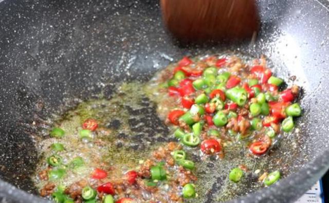 步骤四:这里开小火慢慢煸炒出油,然后倒生抽、蚝油、少量的盐调味。再放入切好的辣椒段,炒出香味,最后把准备好的粉丝,给倒入锅内,不断翻炒。