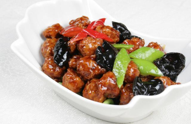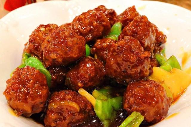 步骤七:然后在锅里,重新加入少许的食用油,里面下入姜蓉和葱白爆香,把酱汁倒入锅中煮开,调半碗水淀粉。再下入丸子,快速翻炒使丸子裹上酱汁即可出锅。
