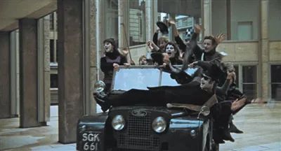 紧接着,从镜头前“冲”进一辆吉普车,车上塞满面涂小丑妆容的青年学生。他们打扮花哨入时,吵吵嚷嚷,与周边破败、冰冷的建筑形成鲜明对比。随后,这群嬉皮士从车上下来,卷入人群,拦截下路过的车辆,并向车里的人讨要零钱。