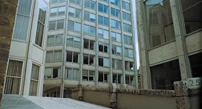 《放大》以典型的安东尼奥尼式镜头开场,摄影机以仰视的角度对准一处荒凉、萧条的现代主义建筑,给人冷冰冰的感觉。观众看到墙面上整齐划一的窗户,不过不少窗户都破败了,玻璃碎裂,看样子并没有人住在里面或被人使用。