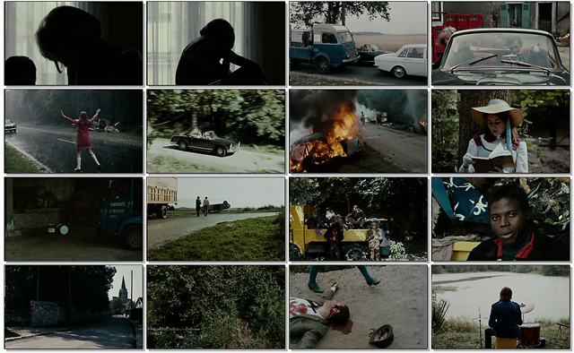 戈达尔用一种高度艺术化、形式化的手法来表达现代社会遭遇的种种问题,与科塔萨尔在小说中的表达殊途同归。在此,影像不再依循现实的逻辑被摄录,而是基于一种先行的理念。正是在理念的光芒照耀下,《周末》中无序、散乱、抽象的元素被整合到一起,从而获得一种思想阐释上的真实,这不是影像写实的真实。