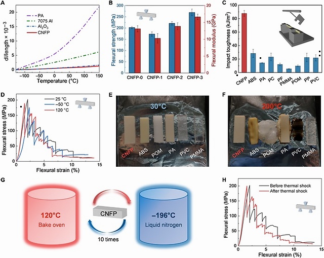 (A)CNFP(平行于层),聚酰胺(PA),铝合金(7075 Al)和Al2O3的热膨胀。 (B)比较不同种类的CNFP的弯曲强度和刚度。 (C)将CNFP-0的热比冲击韧性与其他广泛使用的聚合物基材料进行比较。 (D)在不同温度下CNFP-0的弯曲应力-应变曲线。 (E和F)在(E)30°C和(F)200°C下,CNFP-0与其他广泛使用的聚合物基材料的比较。 (G)10次快速热冲击的示意图。 (H)快速热冲击10次前后CNFP-0的弯曲应力-应变曲线。 PMMA,聚甲基丙烯酸甲酯; PVC,聚氯乙烯; ABS,丙烯腈丁二烯苯乙烯; PC,聚碳酸酯; PF,酚醛树脂; POM,聚甲醛; PP,聚丙烯。