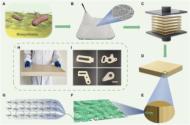 (A)CNF水凝胶可以通过生物合成来生产。 (B)CNF水凝胶及其坚固的三维纳米纤维网络。 (C)在80℃下压制处理过的CNF水凝胶的许多层以制造CNFP。 (D)CNFP的示意图。 (E)CNFP的多层结构。 (F)CNFP中一层的坚固的三维纳米纤维网络。 (G)纤维素分子链通过氢键紧密结合在一起,并在CNF表面暴露出许多–OH基团,形成纤维间氢键。 (H)体积为320毫米×220毫米×27毫米的大型CNFP的照片。 (I)用铣床生产的形状不同的CNFP零件。比例尺:1厘米(I)。