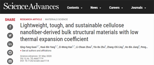 近日,由中国科学技术大学(USTC)的俞树宏院士领导的团队研发出一种稳健可行的策略,可将CNF加工成具有低密度、出色的强度和韧性以及出色的热尺寸稳定性的高性能块状结构材料。相关研究论文近日发表在《科学》子刊Science Advances上,题为“Lightweight, tough, and sustainable cellulose nanofiber-derived bulk structural materials with low thermal expansion coefficient”。