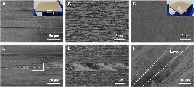 (A)插图中标记区域的SEM图像,清楚地显示了每层约20μm的多层结构。插图是CNFP的照片。 (B)CNFP中一层的放大SEM图像,显示了CNF的微观分层结构。 (C)插图中标记区域的SEM图像,显示了坚固的三维纳米纤维网络。许多CNF相互缠绕在一起,并通过强大的氢键结合在一起。插图是CNFP的照片。 (D)断裂的CNFP-0的轮廓显示约20μm层之间的滑动。 (E)许多CNF相互缠绕在一起,并在各层之间合并在一起[(D)中标记区域的放大显微照片]。 (F)CNFP斜切面的SEM图像。在不同的层之间,大量的CNF从该层中拉出并相互缠绕。