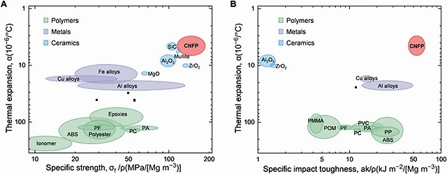 (A)与典型的聚合物,金属和陶瓷相比,CNFP的热膨胀与比强度的阿什比图(1,41-46)。 (B)与典型的聚合物,金属和陶瓷相比,CNFP的热膨胀与比冲击韧性的阿什比图(1)。