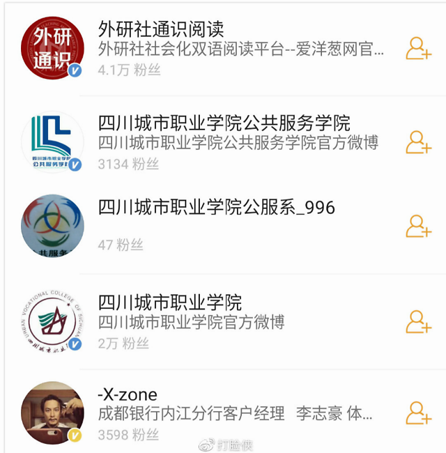 查看此人的关注列表,发现了外研社,四川城市职业学院,以及成都银行的相关账号,完美呼应了此前提到的有关学校、职业、英语比赛获奖等线索。