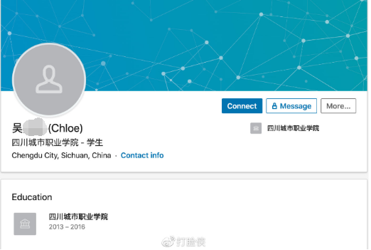 通过搜索,我们发现了吴XX的领英页面,中文名、英文名,以及所在地,均符合。所以吴XX极有可能是2016年四川城市职业学院毕业的(不排除该学校恰好有另一个同名同姓,英文名也叫Chloe的吴XX)。