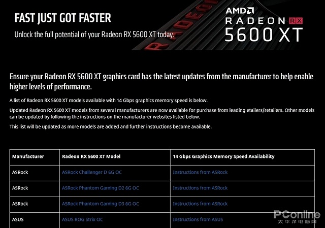 5600XT的新BIOS虽然来自AMD,但还是需要经过各大显卡厂商进行测试后,才会正式发布给公众,所以新BIOS也只能从各大显卡厂商官网找到。不过AMD为大家准备了一个指引页面,直接指向各大显卡厂商官网的发布新BIOS的相应链接,省去了大家到显卡厂商官网寻找的功夫。