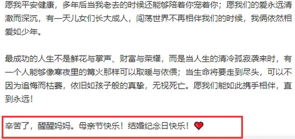 而母亲节是汪峰与章子怡的结婚纪念日,正巧赶在了一天。汪峰发文感谢妻子对家庭付出的爱,感谢她这么辛苦的付出。