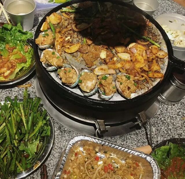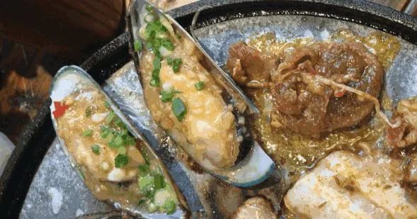 除了基本的烤肉之外,在么子烤肉还推荐加了蒜蓉的青口贝,据说是长沙首创。青口肉壳相连表示是新鲜的。不过因为青口个头够大,烤的时间比较久,所以建议从最开始就放在铁盘边上慢慢烤。另外烤花甲也是一大亮点,超大一盘,连盘子一起烤,感觉这个海鲜吃得real壕!