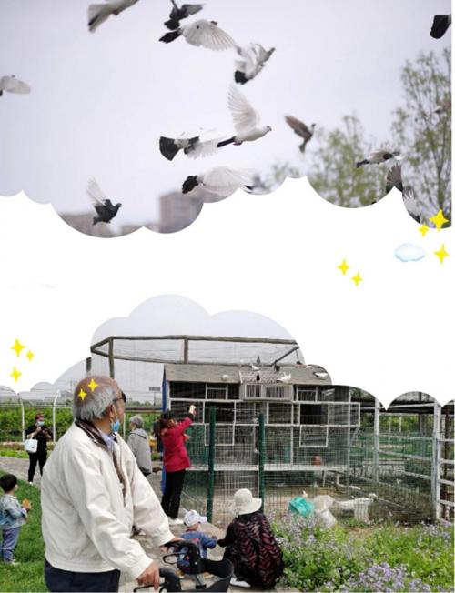 欣赏完美丽的孔雀,往前走去,远远地就看到了由两只大鹅守卫的鸽子。养鸽子的大叔熟练地打开笼子,挥手洒出鸽粮,灰白相间的鸽子展开双翅在空中鸣啭,划出一道道优美的曲线。