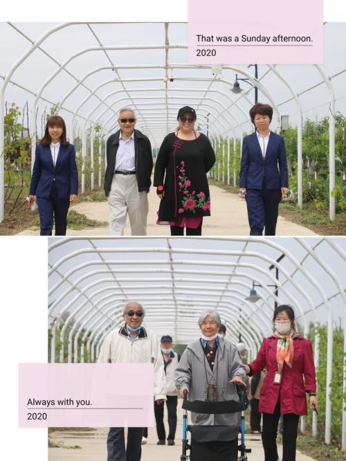 品尝蔬果后,长者们在员工的陪护下沿着小路,仿若走秀一般的寻觅着春天遗留的痕迹,观赏着初夏的绿色,朝着重要景点萌宠乐园走去。