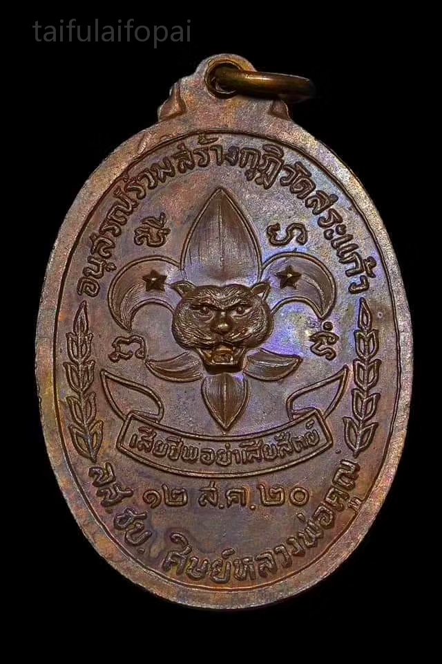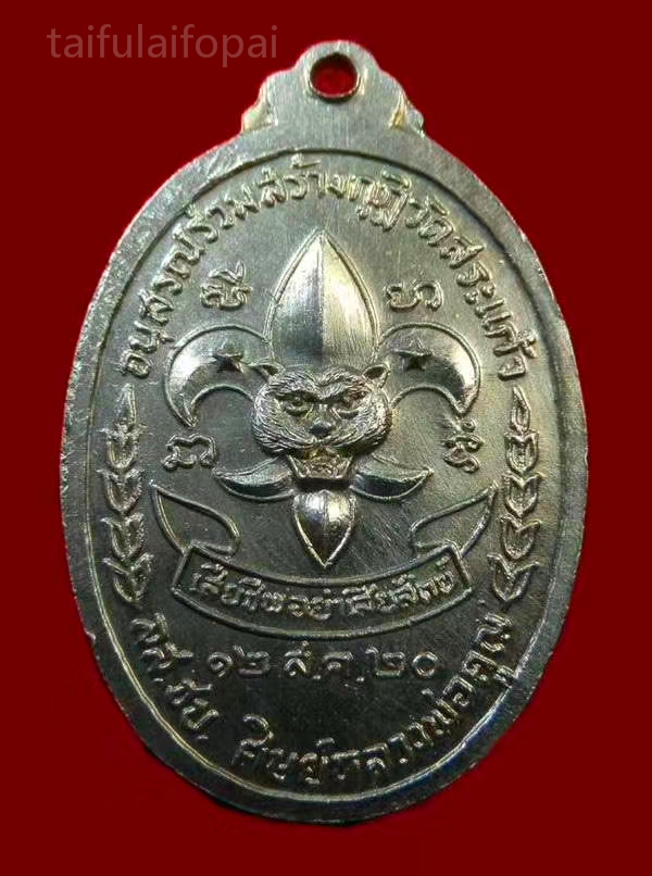 佛历2520年,当时泰国虽然已经从二战的摧残中解脱,但是边境地区治安动荡,东北部屡有战火发生,随着老挝和越南的政治关系变化,泰国的国防压力加大,碰巧正是泰国军队青黄不接的时候,需要更多的士兵、军官人才加入军队。龙婆坤为了国家平安稳定,号召年轻人参军,特别在这一年督造加持了这款自身像佛牌筹集善款,向社会呼吁大家送孩子去军校学习,报效祖国。佛牌背面特别设计童子军徽章,后被誉为童子军徽章,可见师傅匠心独具。