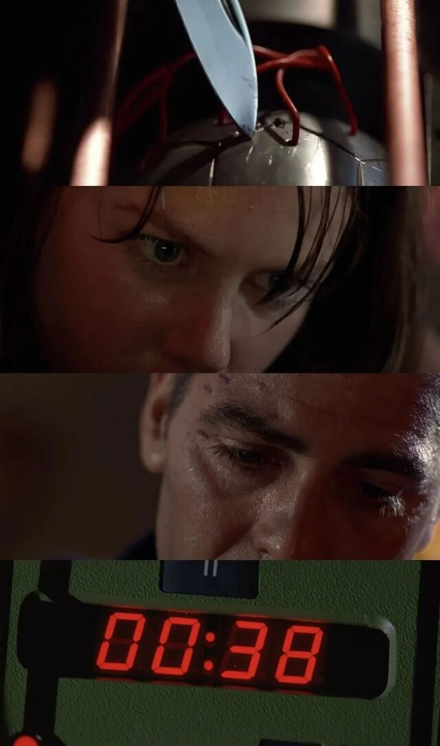 大特写用来凸显角色的面部表情、绝命书,或者眼球的画面等。在《和平缔造者》(The Peacemaker,1998)中,数字计数器与原子弹的引爆装置相连,当身为火箭科学家和反恐专家的妮可·基德曼最后成功拆除爆炸装置时,数字计数器显示的剩余时间是0.01 秒。如果没有大特写,那么这部电影肯定不会那么精彩。